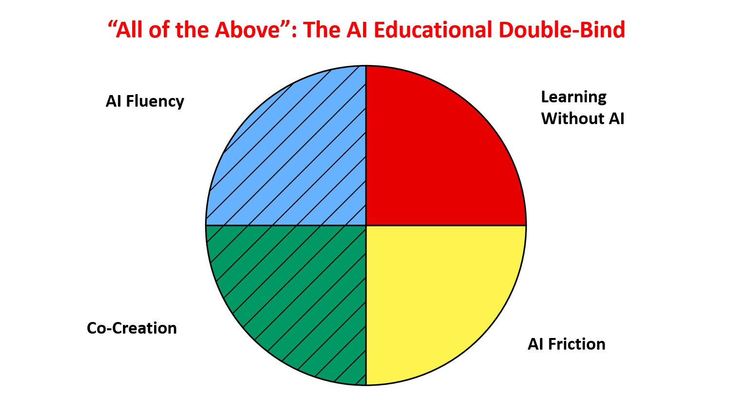 But if we do nothing but “leaning in” (the left hemisphere of this chart), there is a risk that some students will use AI to bypass their own thinking and their own learning. In those cases, we may want to introduce AI friction, so that it’s not simple for students to use AI. Some of our assignments might need to switch deliverables to make it hard to simply use AI to complete the assignments. Others might need adjusting to be more AI-resistant. And, importantly, we need to find ways to convince students that taking AI shortcuts are not in their best career interests, creating space for some writing assignments to remain in the curriculum.